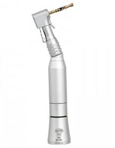 Contra Ângulo Intra MX 20:1 - Dentscler para perfuração e inserção de implantes, com refrigeração externa ao corpo, acoplável ao micro motor com sistema intra onde o torque e a rotação são transmitidos à broca através de um conjunto de eixos e engrenagens com rotação de transmissão 20:1, corpo em alumínio anodizado, giro livre de 360° sobre o micro motor, cabeça e luva da união desmontável para limpeza, trava da broca por lâmina de aço deslocável lateralmente em ângulo com encaixe para adaptar-se ao canal da broca.